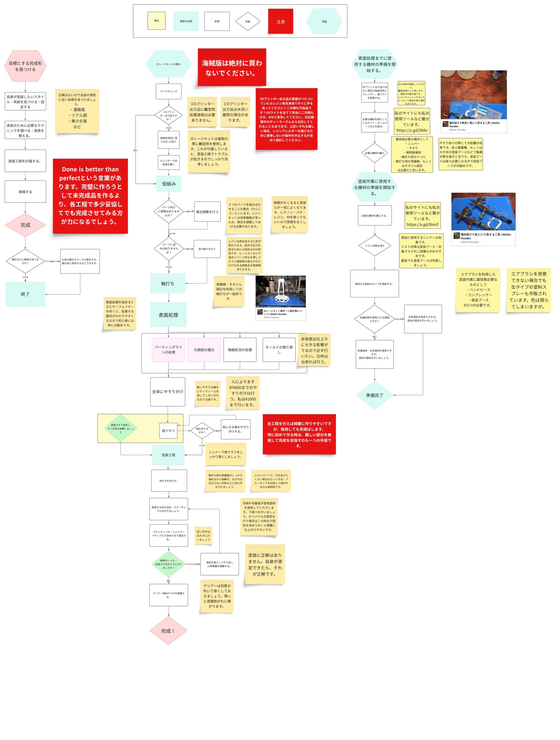 これからガレージキットを始める人、ガレージキットを始めた人が、次の作業に迷わないために、抑えておくべき作業・準備・心構えを網羅的にフローチャート形式にまとめました。